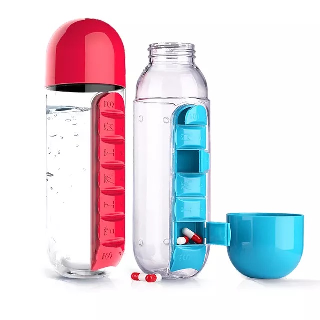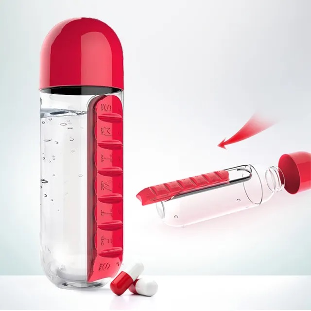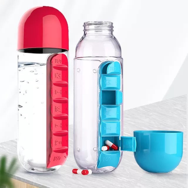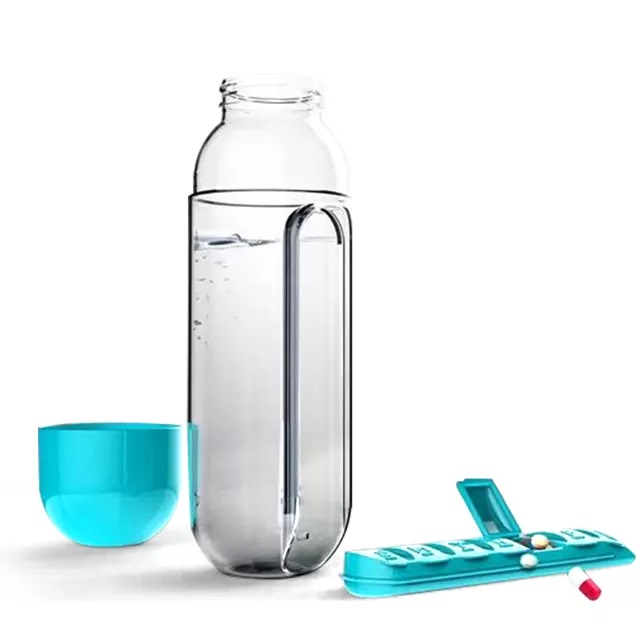 Oltre i contenitori di pastiglie, la bottiglia dispone del tappo che si puo transformare in bicchiere risolvendo 2 problemi in 1.